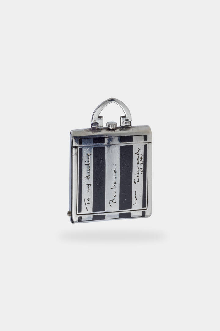 Cassa di forma, in argento, con decori a righe in smalto nero. Quadrante argento con numeri arabi luminescenti e minuteria serigrafata.