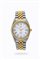 Cassa in acciaio con fondello a vite e lunetta dorata godronata. Quadrante bianco con indici applicati e datario al 3. Bracciale in acciaio e dorato integrato con chiusura clasp.
