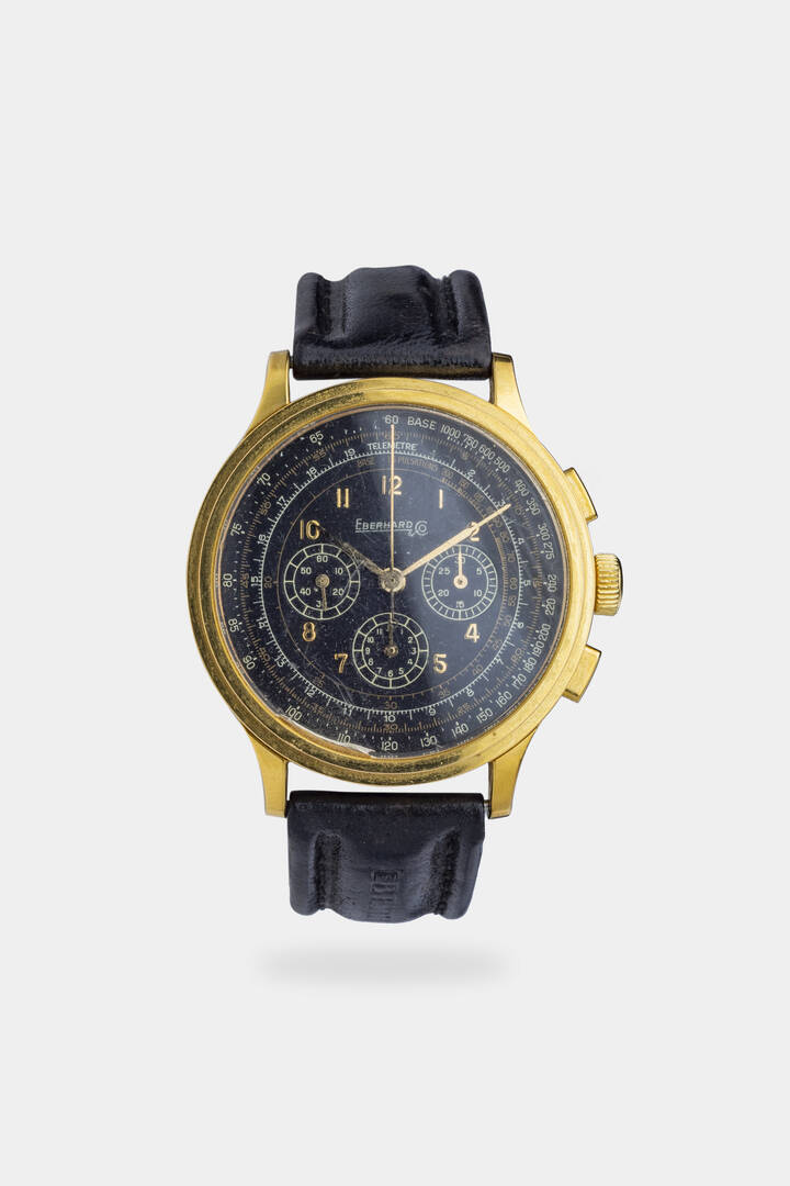 Cassa placcata con fondello a pressione in acciaio. Quadrante nero con numeri arabi applicati, indicazione dei secondi continui al 9, dei 30 minuti al 3 e delle 12 ore al 6. Ai limiti del quadrante troviamo scala tachimetrica, pulsazioni e scala telemetrica serigrafate.