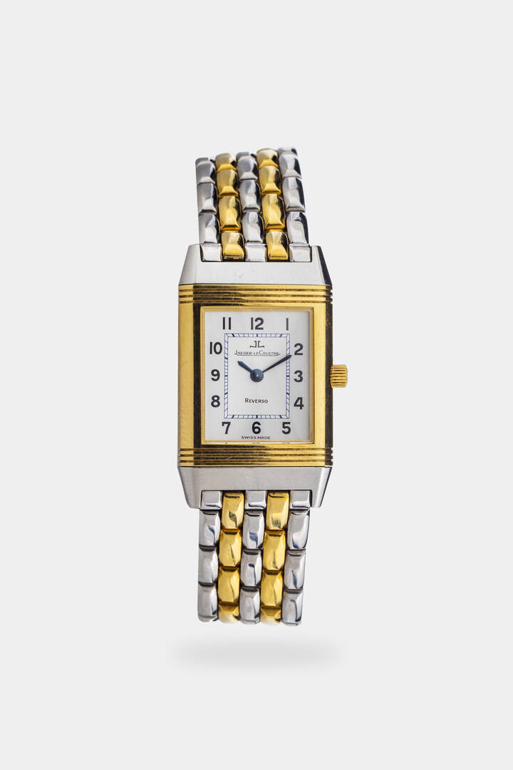 Cassa basculante in acciaio e oro. Quadrante argento con numeri arabi serigrafati. Bracciale in acciaio e oro con chiusura a scomparsa.