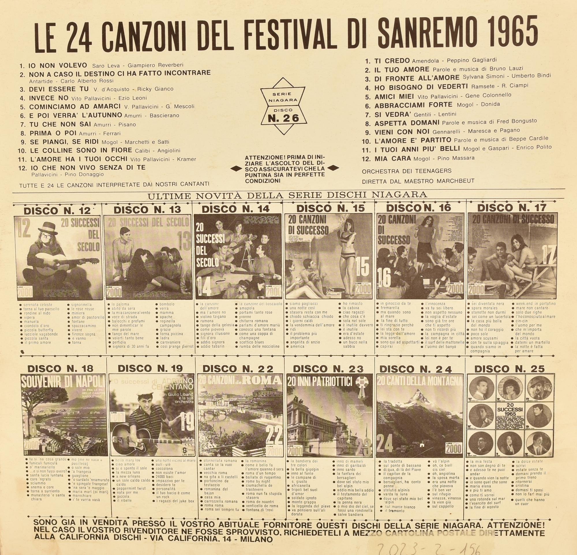 Precedente Lotto 19 Successivo Livebid - Via Tiziano Vecellio 34/D, 10126 Torino DISCHI VINTAGE E DA COLLEZIONE Sessione Unica giovedì 8 giugno 2023 ore 21:00 (UTC +01:00) LP 33 GIRI Le 24 canzoni del festival di Sanremo LP 33 GIRILe 24 canzoni del festival di Sanremo