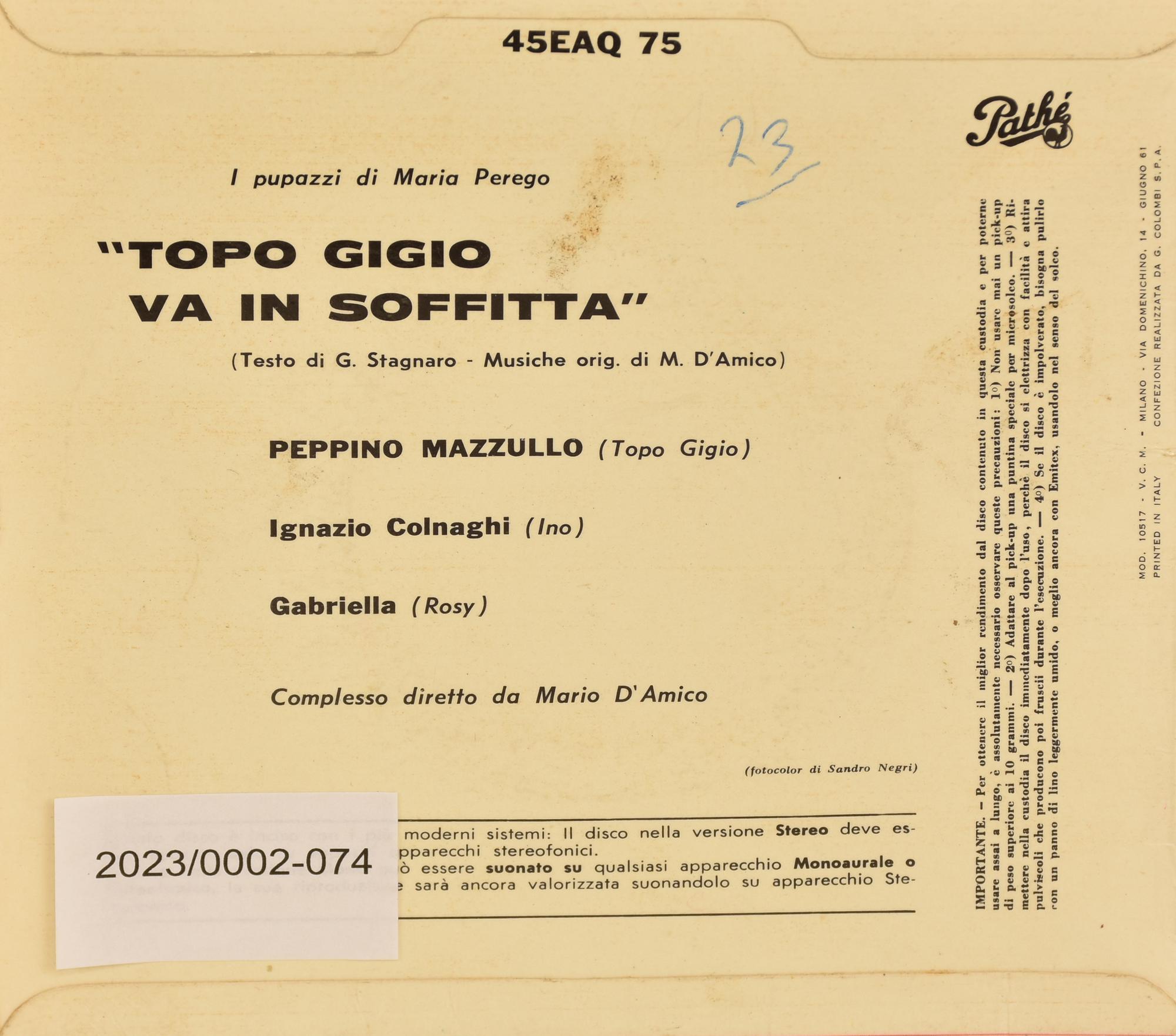 Precedente Lotto 53 Successivo Livebid - Via Tiziano Vecellio 34/D, 10126 Torino DISCHI VINTAGE E DA COLLEZIONE Sessione Unica giovedì 8 giugno 2023 ore 21:00 (UTC +01:00) EP 45 GIRI Topo Gigio, Topo Gigio va in soffitta EP 45 GIRITopo Gigio, Topo Gigio va in soffitta