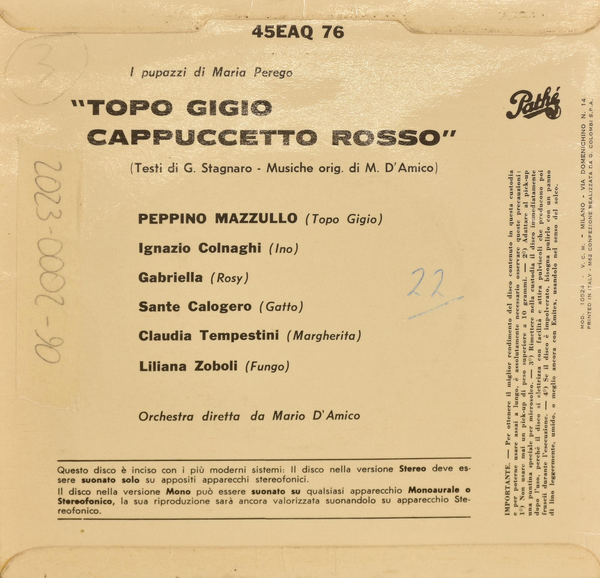 Precedente Lotto 54 Successivo Livebid - Via Tiziano Vecellio 34/D, 10126 Torino DISCHI VINTAGE E DA COLLEZIONE Sessione Unica giovedì 8 giugno 2023 ore 21:00 (UTC +01:00) EP 45 GIRI Topo Gigio, Cappuccetto Rosso EP 45 GIRITopo Gigio, Cappuccetto Rosso
