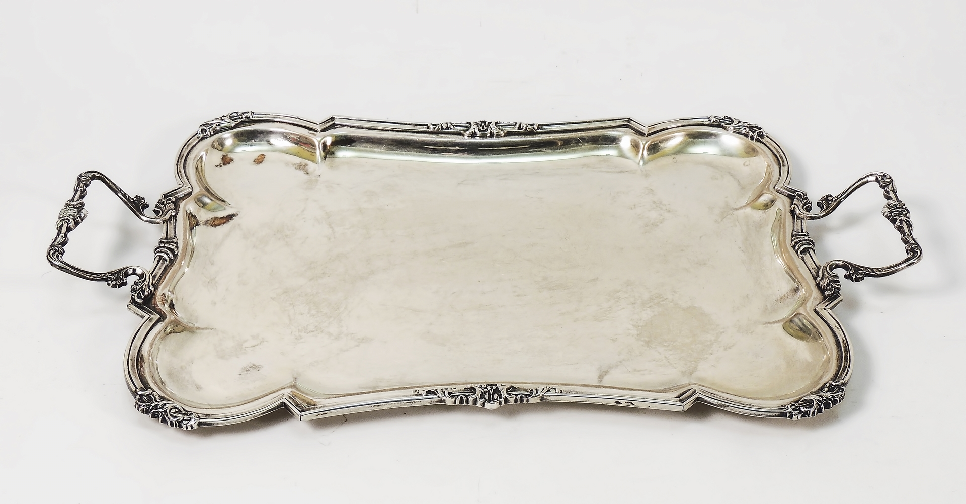 GUANTIERA IN ARGENTO - SILVER TRAY bordo sagomato, manici mossi cm 35x61, gr 2365