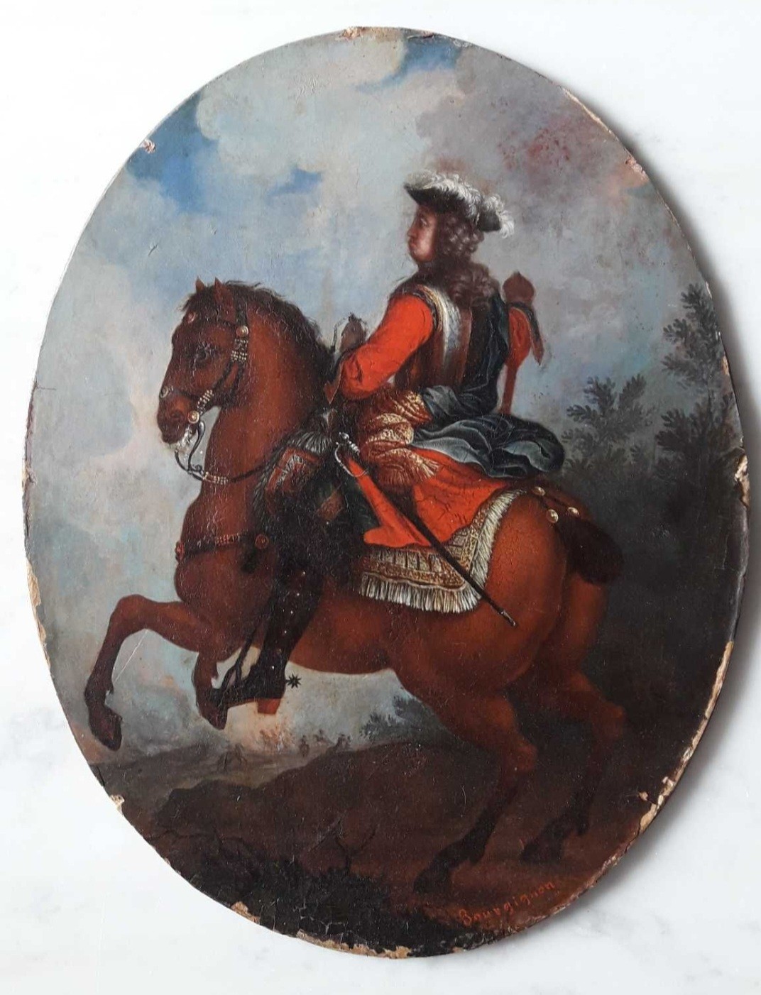 olio su carta riportata su cartone raff.uomo a cavallo firmato in basso a destra scuola francese sec.XVIII