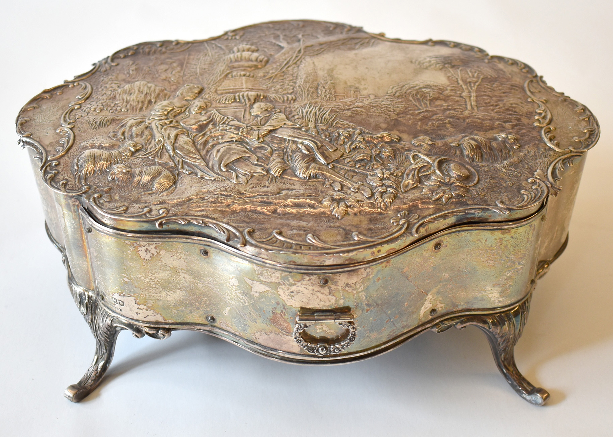 portagioie con cassetto in legno rivestito in argento decorato con scene galanti Londra 1901/2