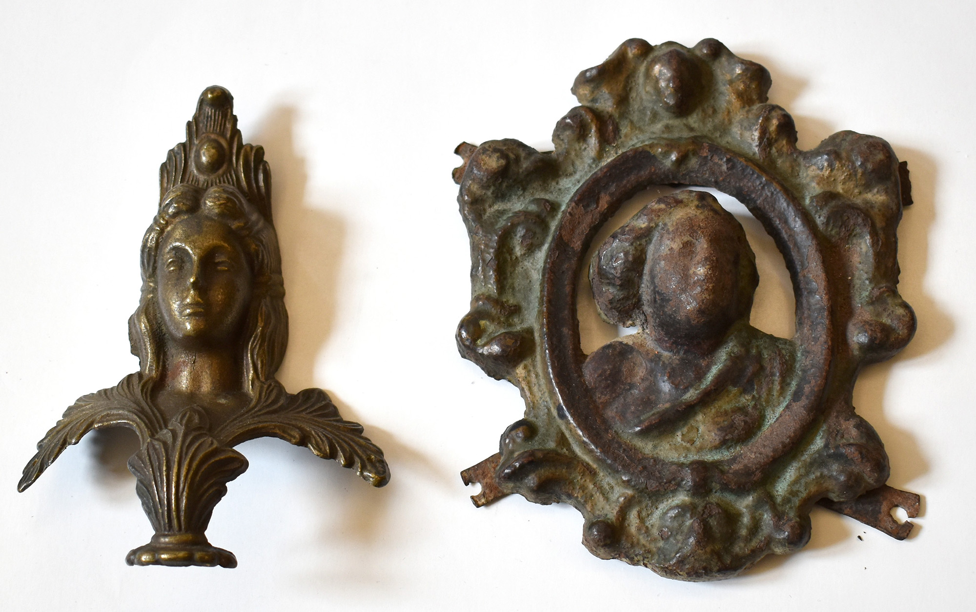 fregio in bronzo raff.donna sec.XIX e elemento decorativo in ferro con figura femminile sec.XIX 15x11 cm 16x13 cm