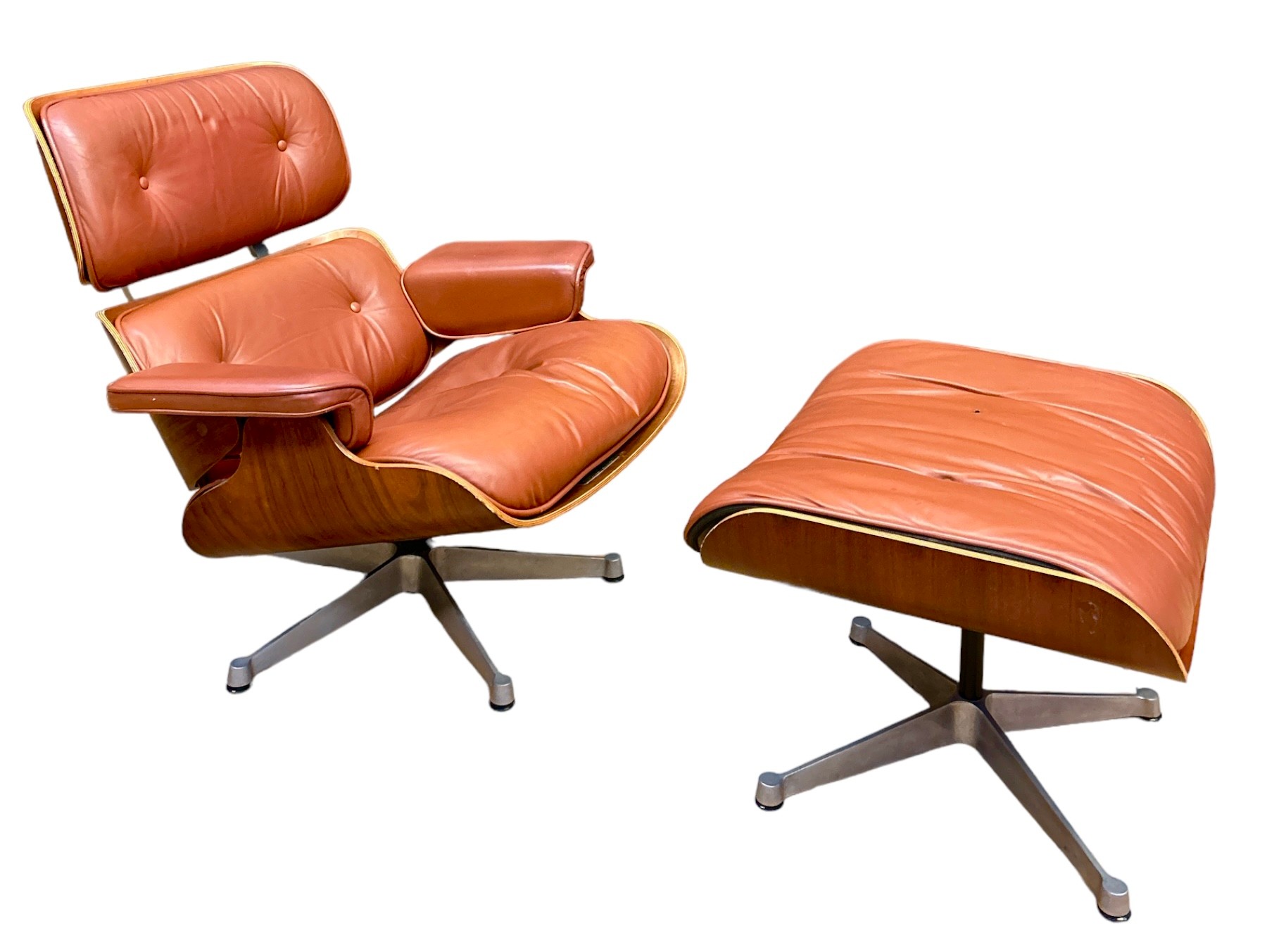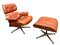 Charles & Ray Eames poltrona con pouf in pelle color cognac produzione ICF Milano