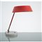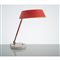 Lampada da tavolo ad una luce in metallo verniciato rosso e ottone, diffusore circolare, base circolare in marmo. Marchio di produzione.