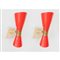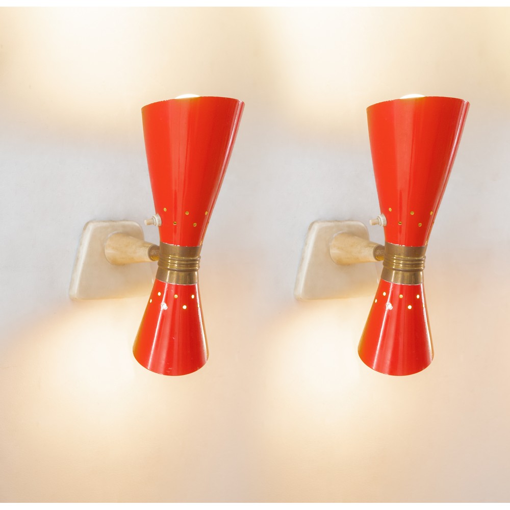 Coppia di lampade da parete a due luci, corpo biconico in metallo verniciato rosso, ottone. Usure.