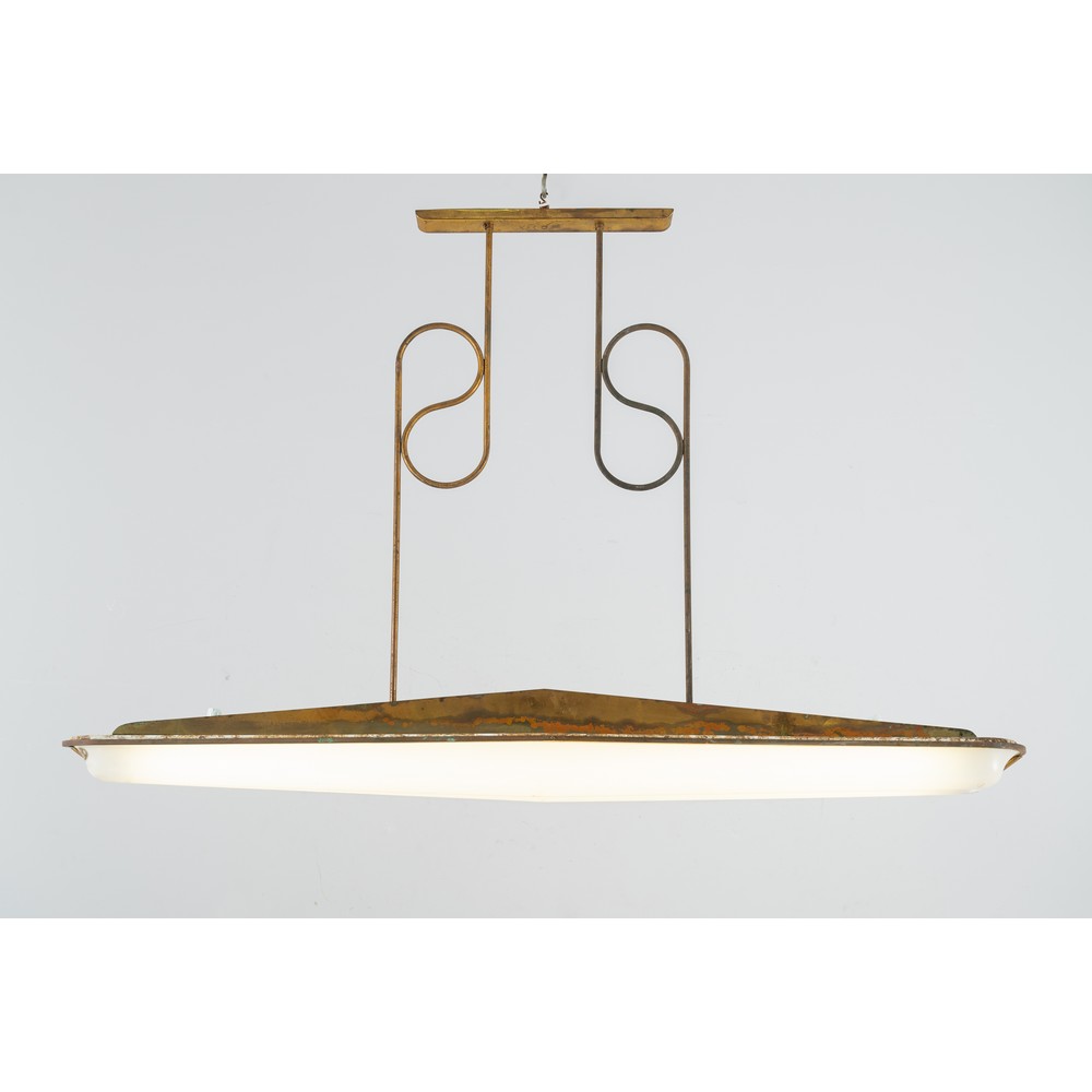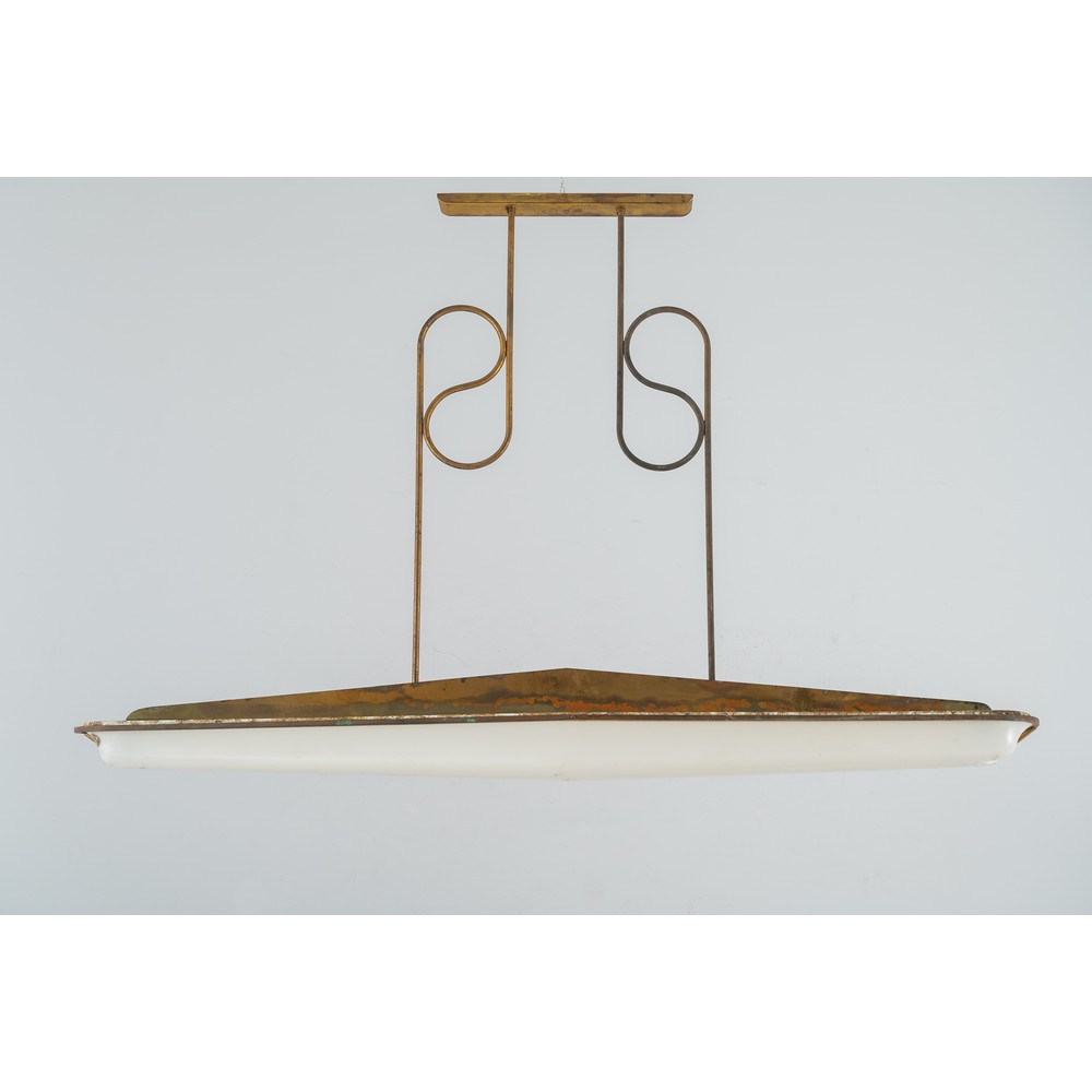 Lampada a sospensione a due luci, struttura in ottone e metallo verniciato, diffusore in perspex lattato.