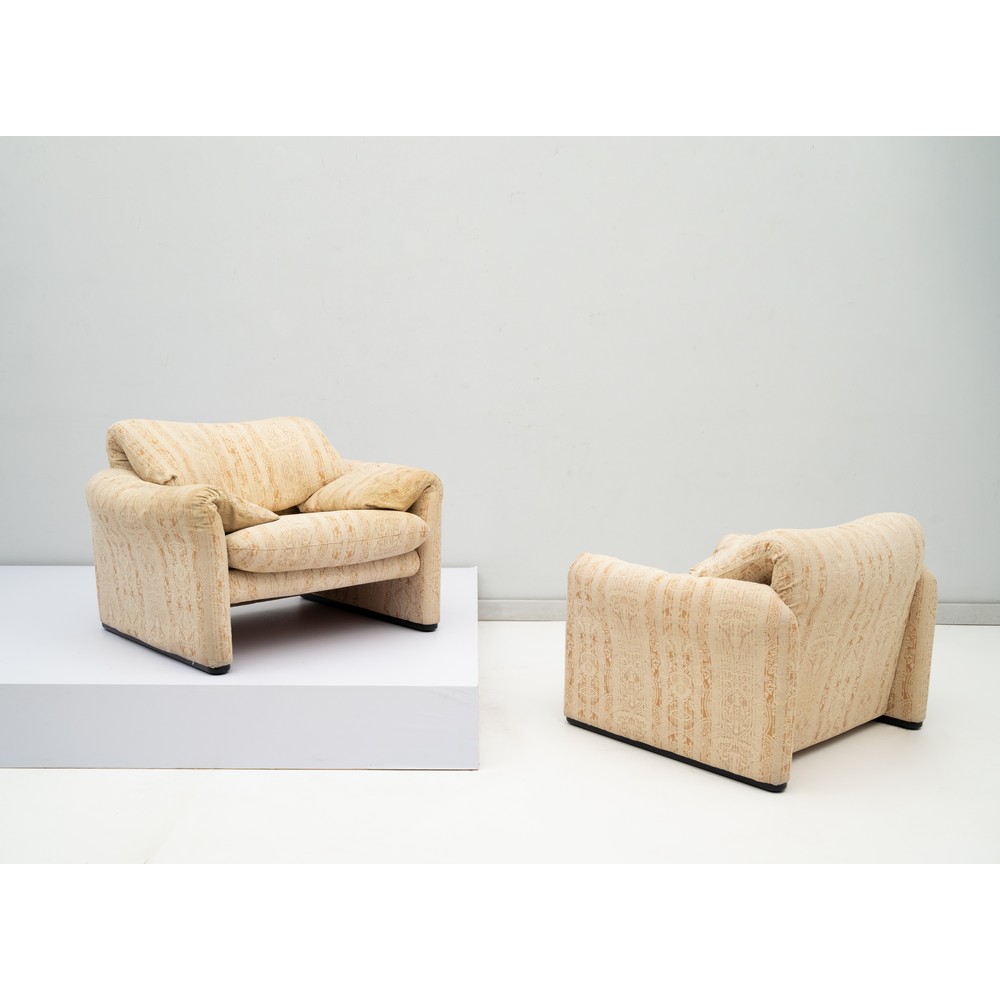 Coppia di poltrone modello “Maralunga”, struttura in metallo con imbottitura in poliuretano, rivestimento in tessuto a righe giallo. Modello vincitore del Compasso D’Oro nel 1979.