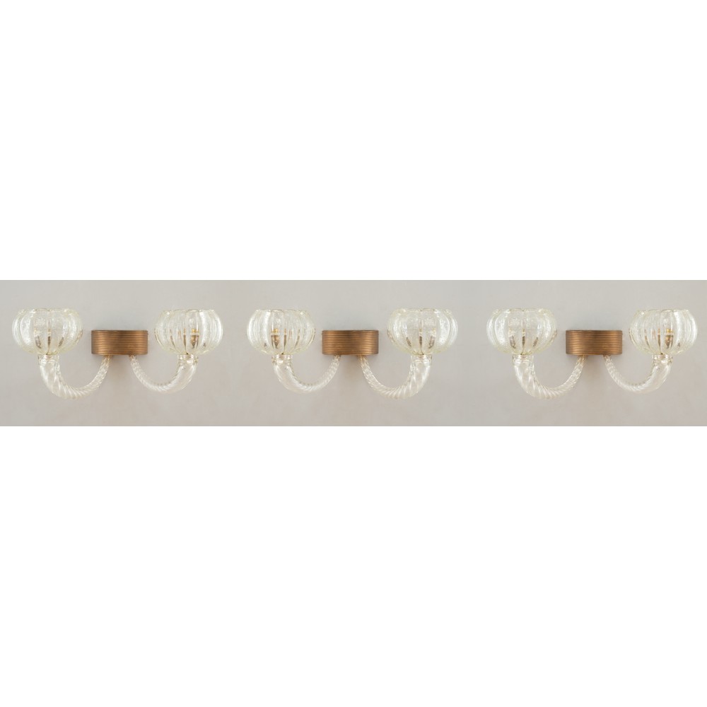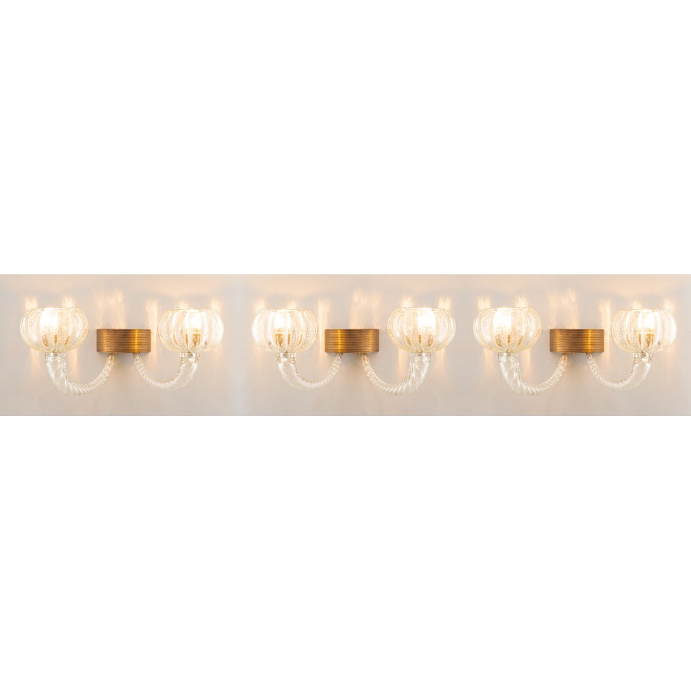 Tre lampade da parete a due luci in vetro trasparente, struttura in ottone, diffusori a coppa semisferica baccellata in vetro bullicante, bracci curvi in vetro lavorato a cordone.