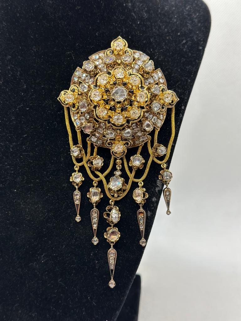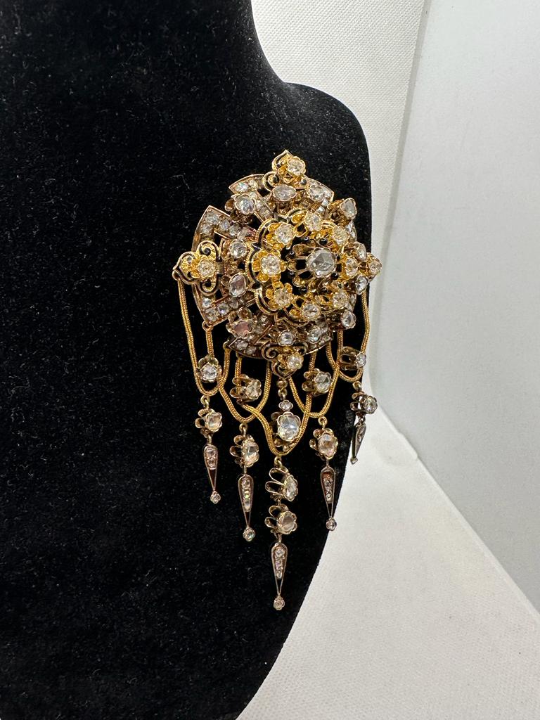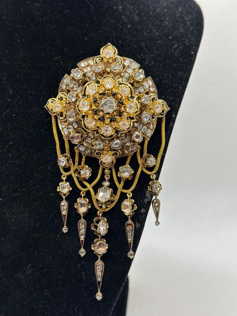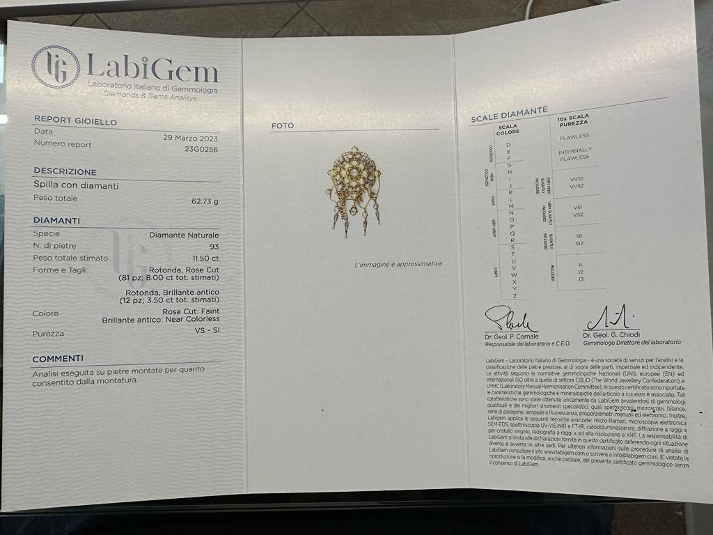 SPILLA IN ORO BASSO CON 93 DIAMANTI NATURALI TOTALI: 81 TAGLIO ROSETTA PER 8 CARATI STIMATI + 12 TAGLIO BRILLANTE PER 3,5 CARATI STIMATI. PUREZZA TRA VS E SI. PESO COMPLESSIVO 63,73 GRAMMI – LABI2