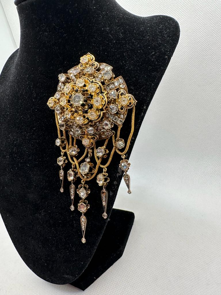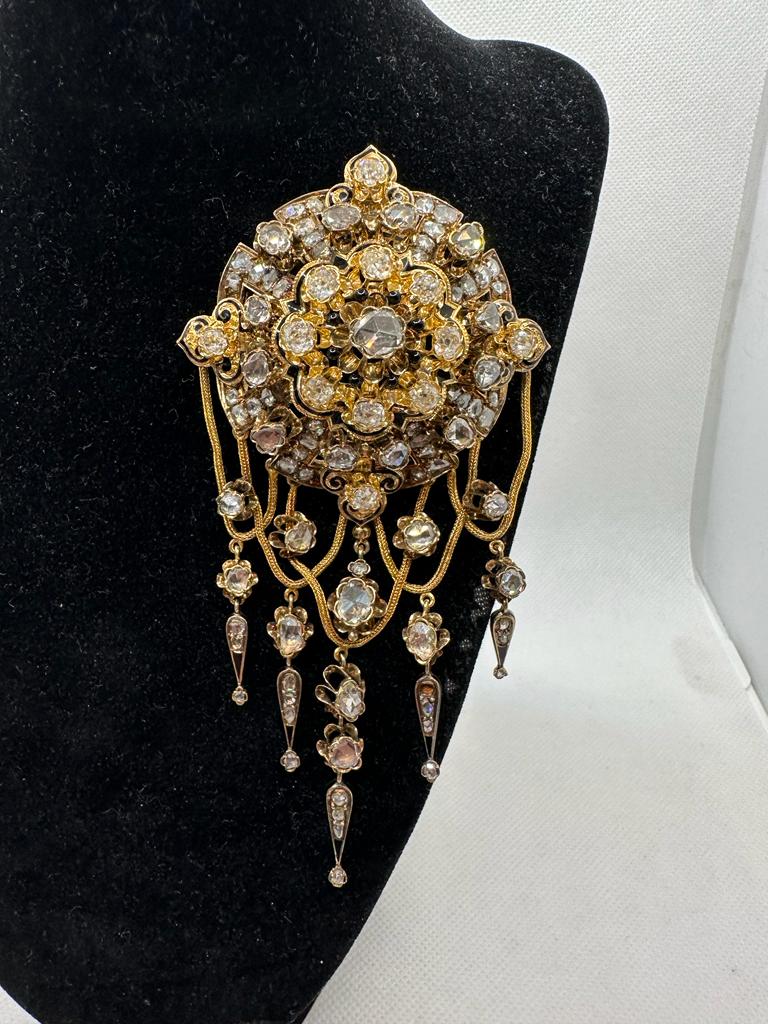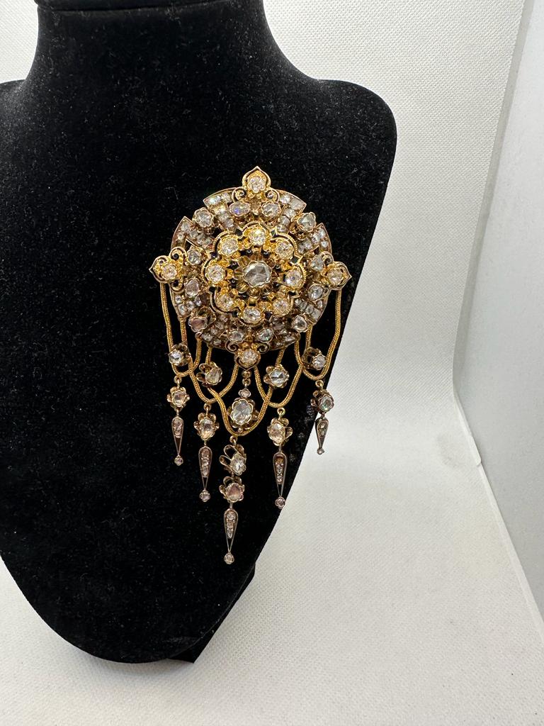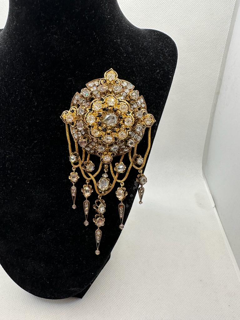 SPILLA IN ORO BASSO CON 93 DIAMANTI NATURALI TOTALI: 81 TAGLIO ROSETTA PER 8 CARATI STIMATI + 12 TAGLIO BRILLANTE PER 3,5 CARATI STIMATI. PUREZZA TRA VS E SI. PESO COMPLESSIVO 63,73 GRAMMI – LABI2