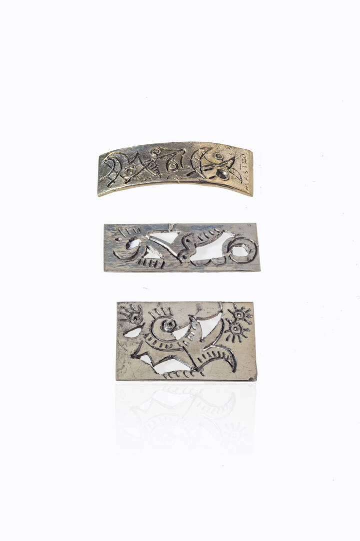 Lotto di tre placche in argento, una firmata "Mastroianni", e di forma arcuata. Decorate con motivi astratti. Esemplari unici