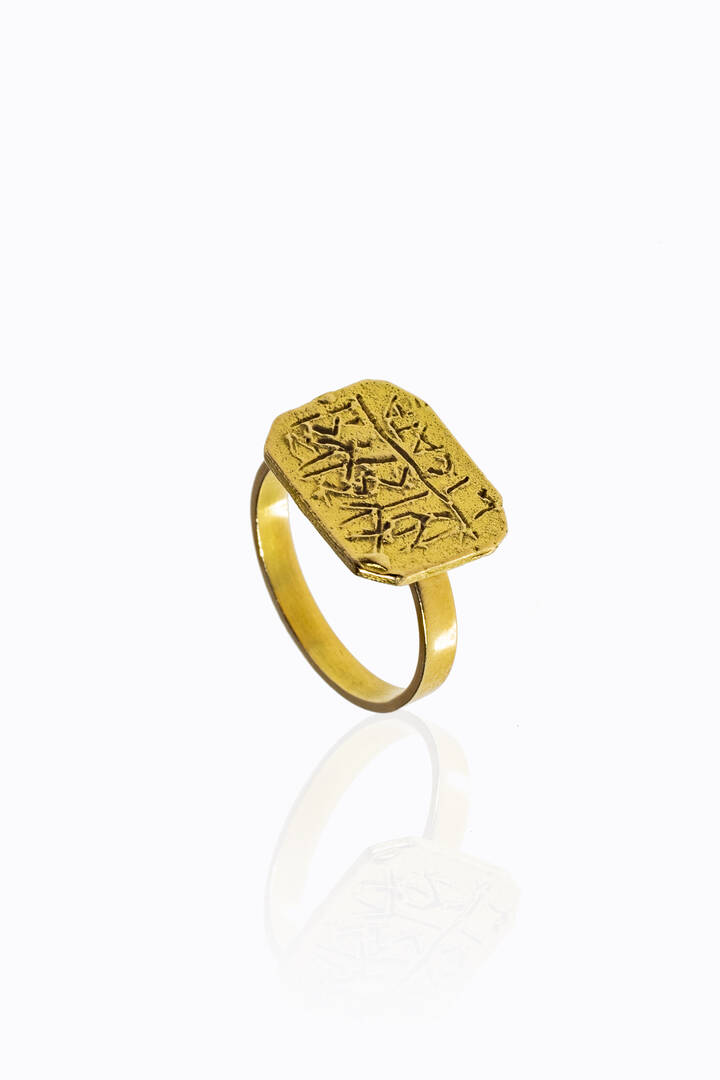 Chevalier in oro giallo, firmato "Licata", sommità con lastra rettangolare incisa con motivi astratti. Esemplare unico