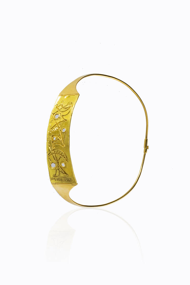 Collier de chien rigido, in oro giallo, firmato "Mastroianni", al centro placca rigida incisa e lavorata a motivi astratti. Esemplare unico.