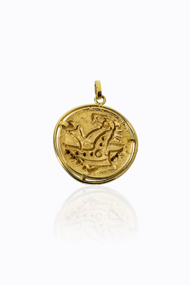 Ciondolo in oro giallo, firmato "Mastroianni", raffigurante un animale mitologico sul fronte e sul retro una composizione astratta. Esemplare unico