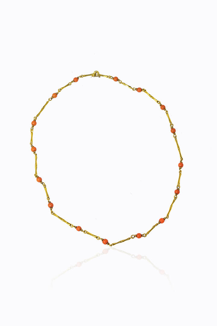 composto da segmenti rigidi in oro giallo alternati a sfere in corallo rosso mediterraneo del diam. di mm 4,3 ca