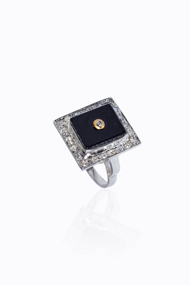 in oro bianco 14 Kt, sommità rettangolare con inserto in onice e diamanti taglio 8/8 per totali ct 0,60 ca