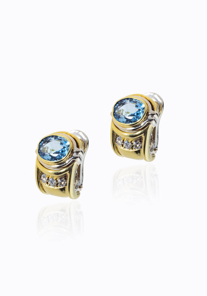 in oro giallo e bianco, a cerchio, con due topazi taglio ovale e diamanti taglio brillante per totali ct 0.25 ca, probabile colore G-H, purezza IF-VVS