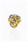 in oro giallo lucido, sommità composta da anelli ovalizzati lavorati a corda e smaltati nei toni del verde e del blu
