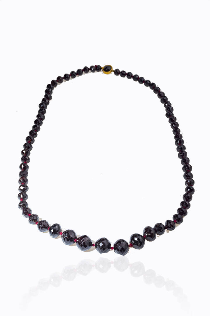 composta da un filo di sfere briolette di granati a scalare. Chiusura in oro rosa di forma rotonda