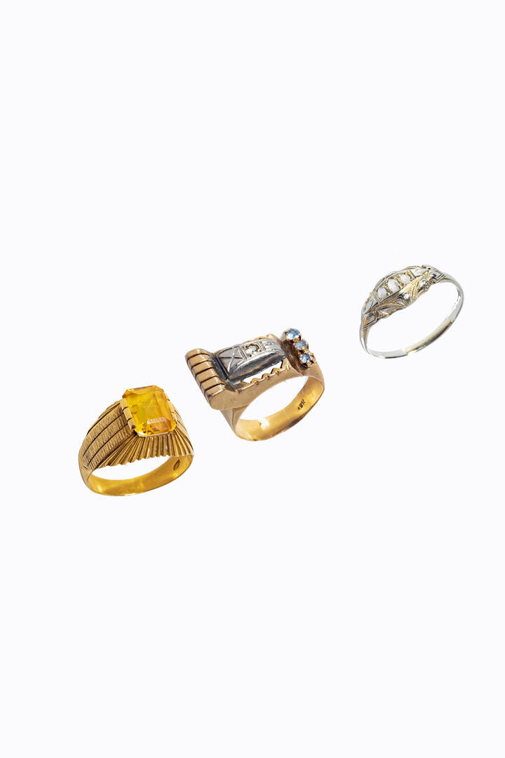 -in oro giallo, anni '40, a forma di voluta e gemme sintetiche. Peso gr 3,9. Misura 9 (49).
