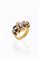 in oro giallo, anni '40, sommità a volute con al centro diamante taglio brillante di ct 0,20 ca e rosette di diamanti per totali ct 0,10 ca