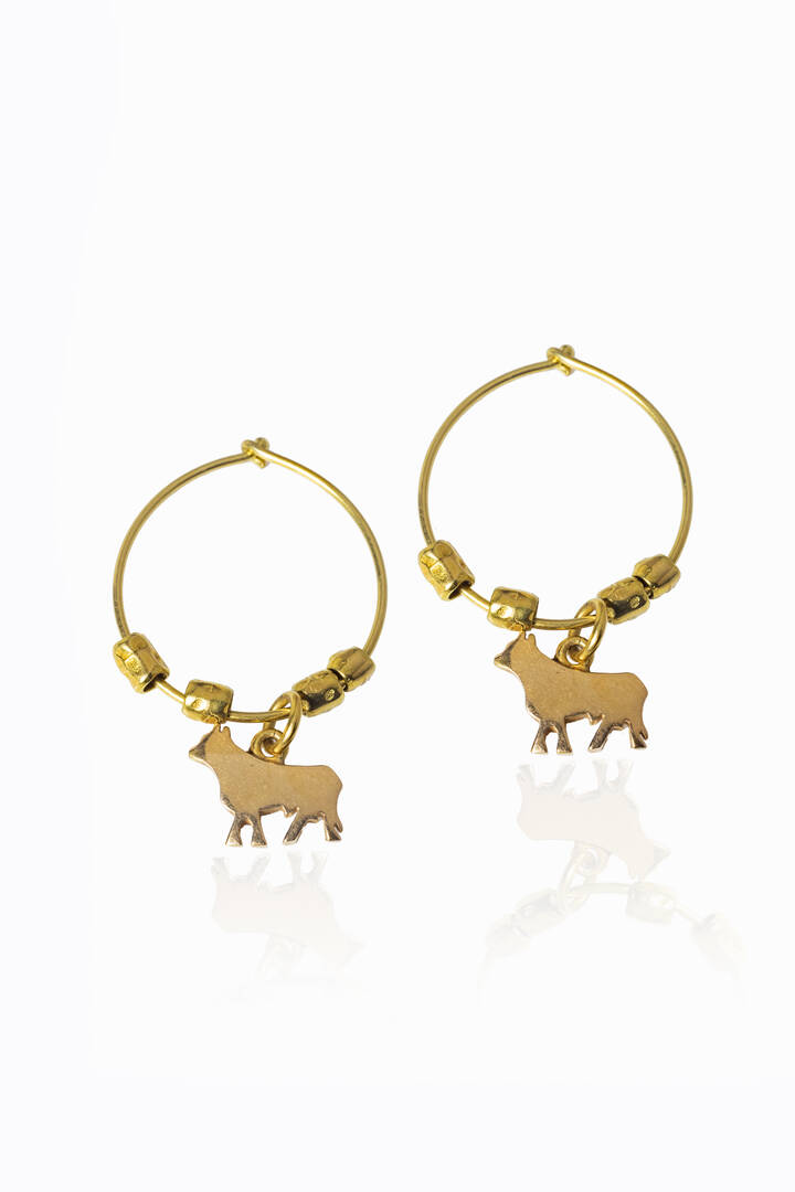 Coppia di orecchini in oro giallo, a cerchio, firmati "Pomellato", linea "Dodo" con pepite e due charms pendenti a forma di mucca.