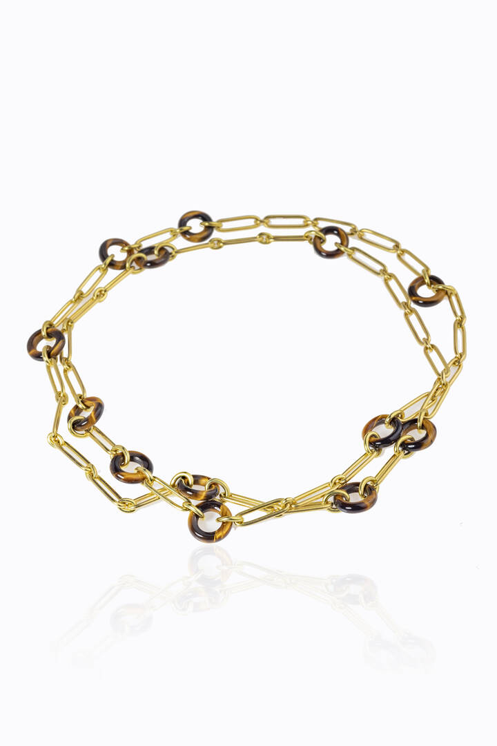 Collana in oro giallo, firmata "Cirio- Torino", ad anelli ovalizzati alternati ad anelli tondi in occhio di tigre