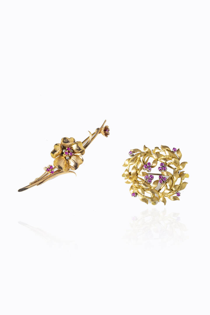 - a forma di ghirlanda con rubini taglio rotondo. Peso gr 13,3. Cm 3,5x3