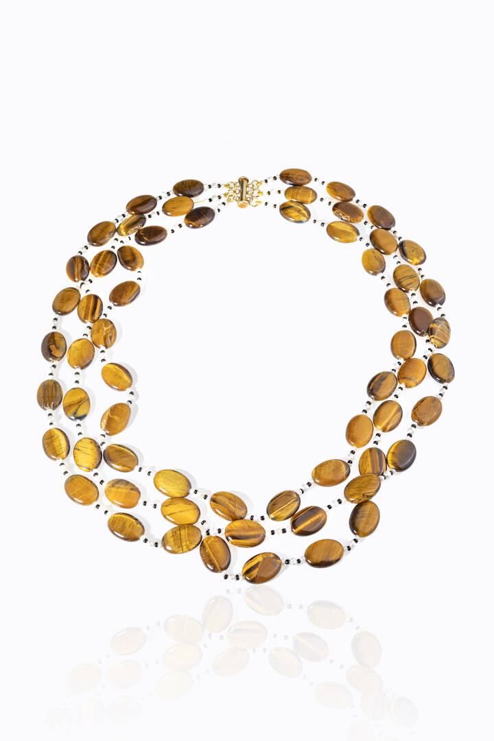 composta da tre fili di ovali in occhio di tigre alternate a perline e dischi in onice. Chiusura in metallo dorato