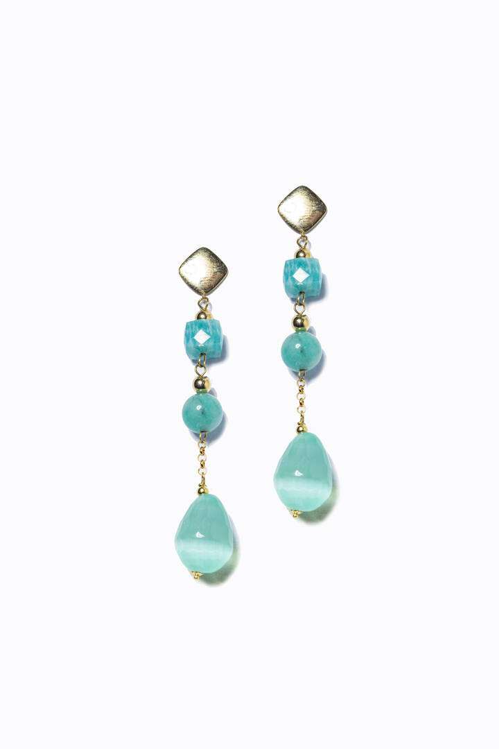 in oro giallo, ai lobi quadrati, da cui dipartono cubi, sfere e gocce in occhio di gatto briolette
