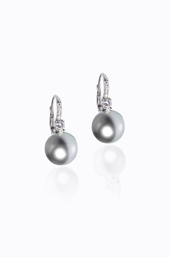 in oro bianco, a monachella, con due perle Tahiti del diam. di mm 12,5 ca, sormontate da diamanti taglio brillante per totali ct 0, 40 ca.