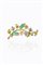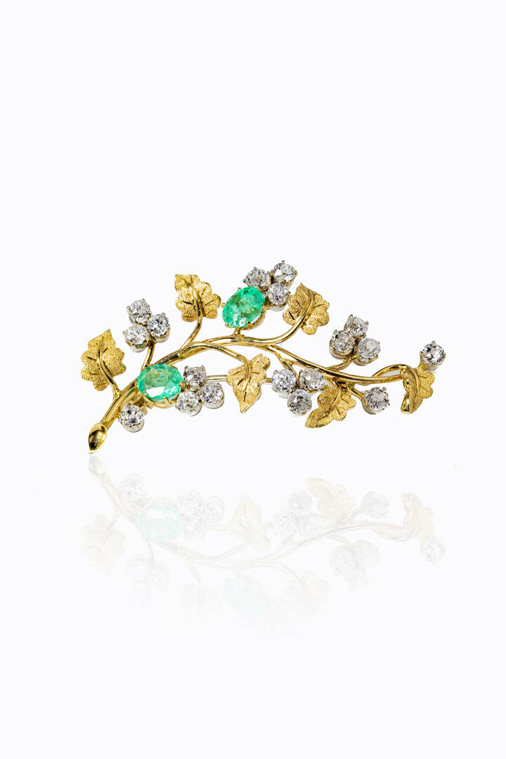 in oro giallo lucido e satinato, anni '40, a forma di ramo fiorito con diamanti taglio vecchio per totali ct 3,30 ca e due smeraldi taglio ovale per totali ct 2,50 ca