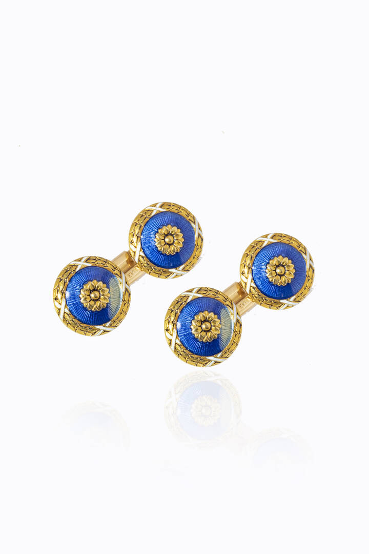 in oro giallo, di forma rotonda, con fiori al centro, in smalti policromi (mancanze); bordo decorato a motivo di foglie di alloro.