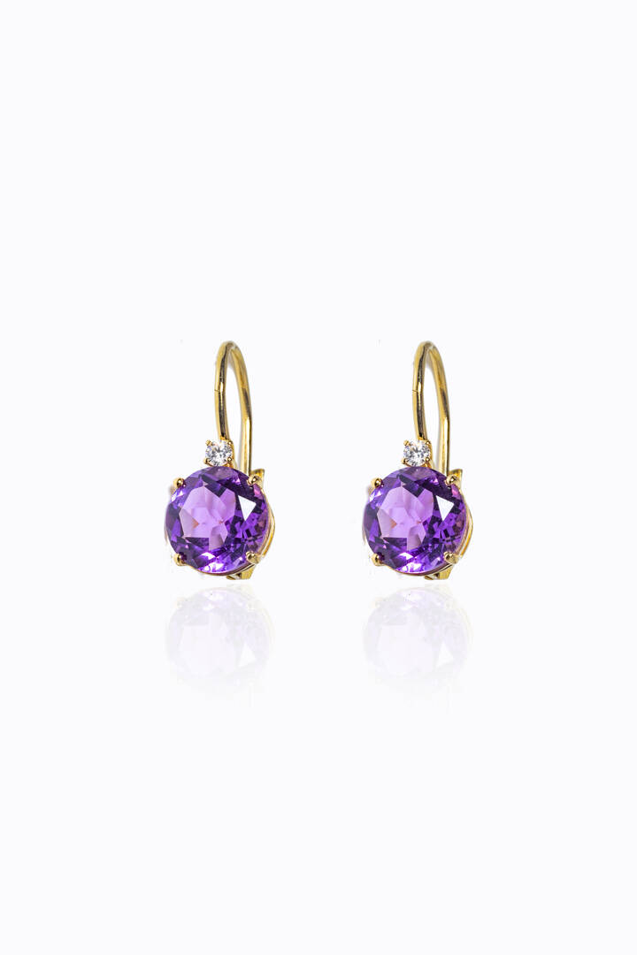 in oro giallo, a monachella, con due ametiste taglio rotondo per totali ct 6,05 ca, sormontate da due diamanti taglio brillante per totali ct 0,10 ca