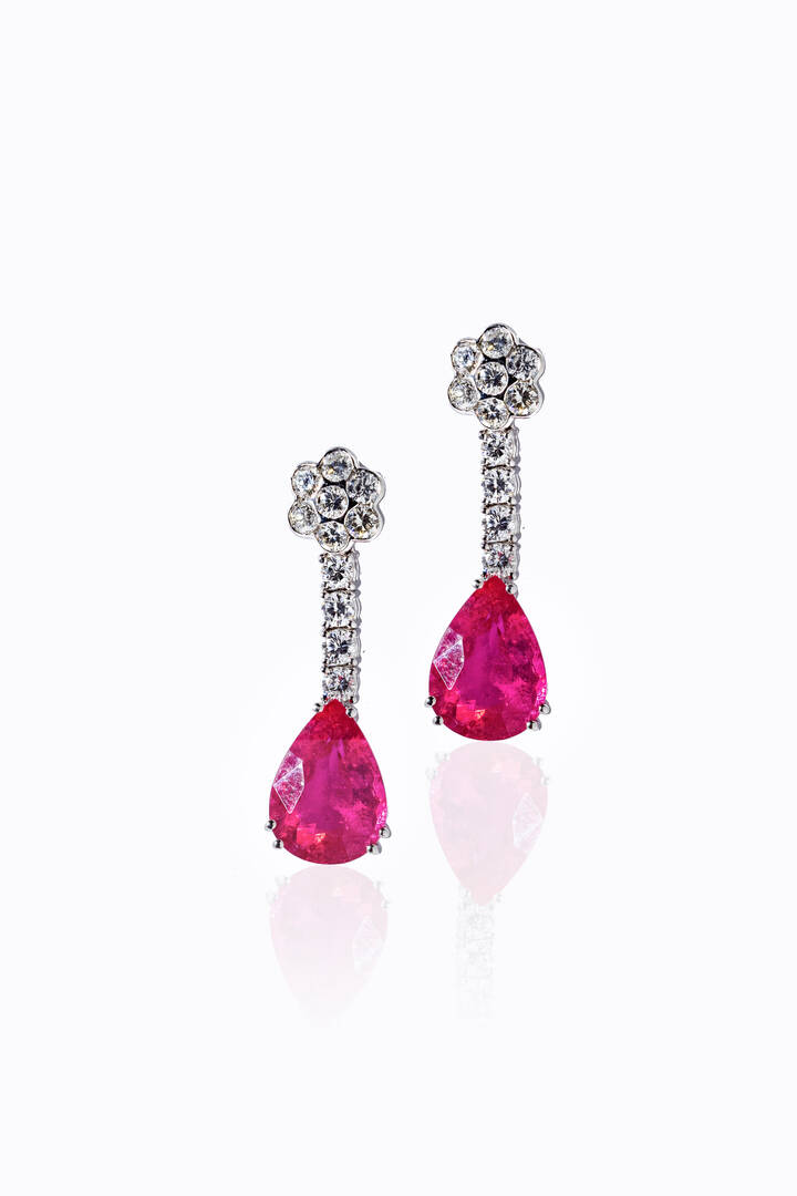 in oro bianco con corpo in diamanti taglio brillante per totali ct1,60 ca, probabile colore G-H, purezza IF-VVS, terminanti con due tormaline rosa taglio a goccia.