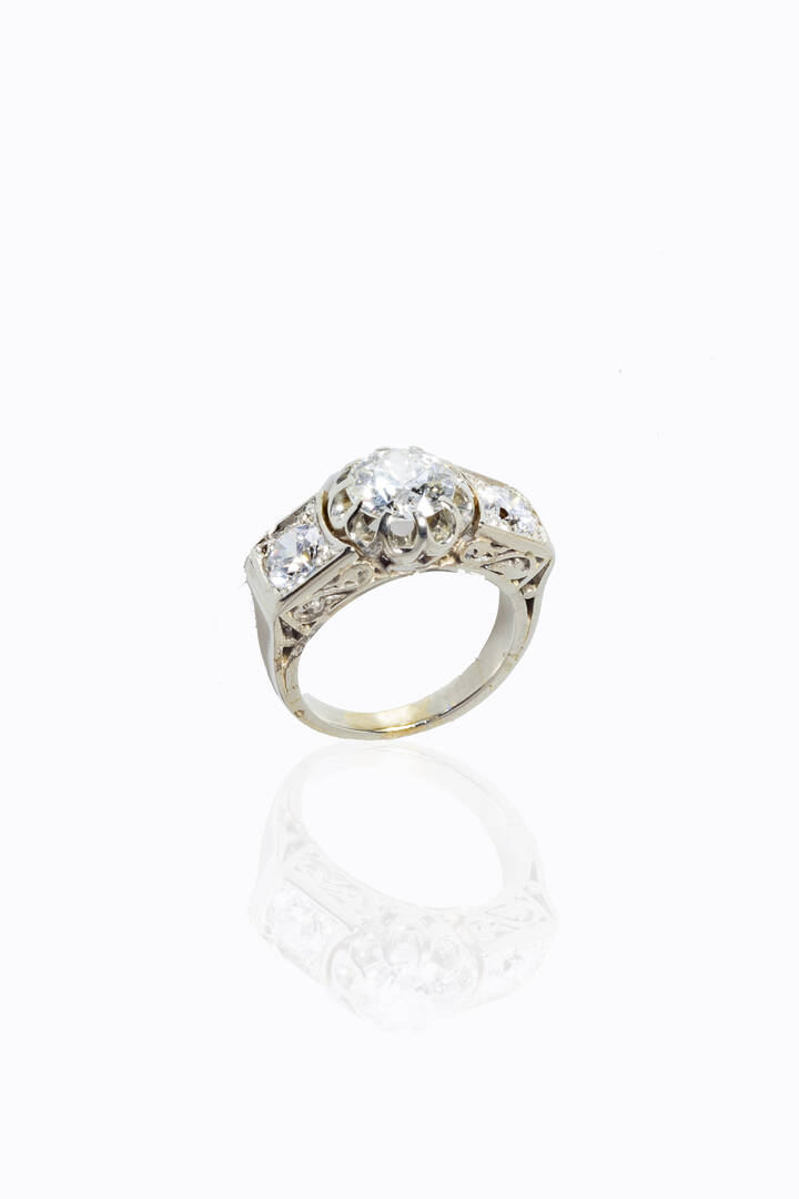 in platino con al centro diamante di mezzo taglio di ct 1,30 ca ed ai lati due diamanti di mezzo taglio per totali ct 1,0 ca