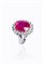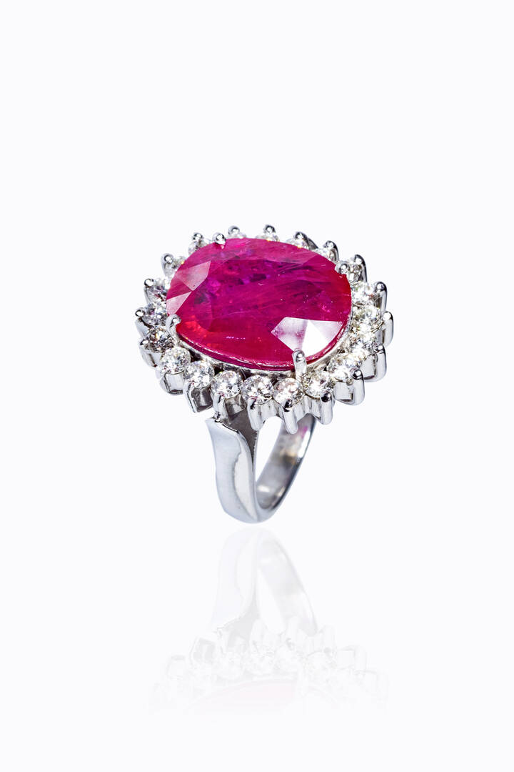 in oro bianco, al centro rubino taglio ovale birmano di ct 7,74, contornato da diamanti taglio brillante per totali ct 1,0 ca, colore G-H, purezza VS-SI