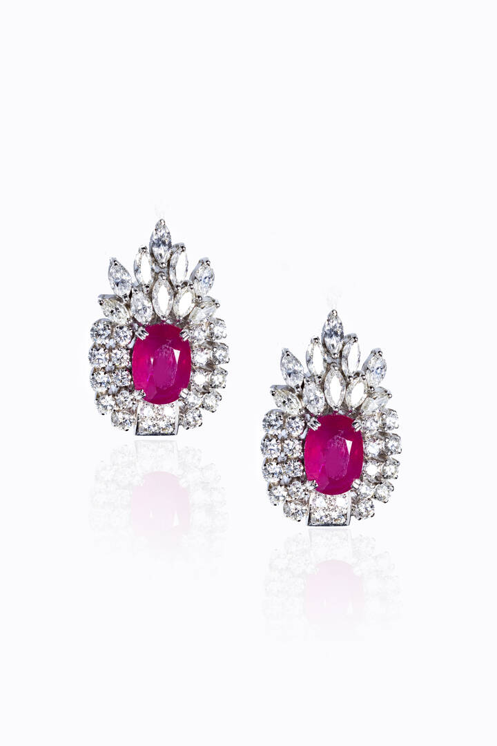 in oro bianco, a clip e con perno a scomparsa per essere indossati a lobo, con due rubini birmani taglio ovale per totali ct 8,50 trattati e doppio contorno di diamanti taglio brillante e navette per totali ct 5,70 ca, colore F-G, purezza VVS-VS
