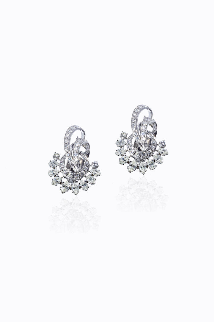in oro bianco, a clip, a volute, anni '50, con diamanti taglio brillante, 8/8 e navette per totali ct 4,0 ca, probabile colore G-H, purezza IF-VVS