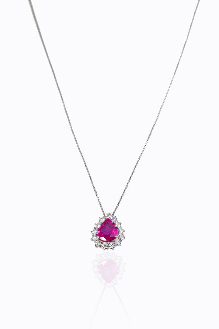 in oro bianco con rubino taglio a goccia di ct 1,52, contornato da diamanti taglio brillante per totali ct 0,57 ca, probabile colore G-H, purezza IF-VVS