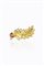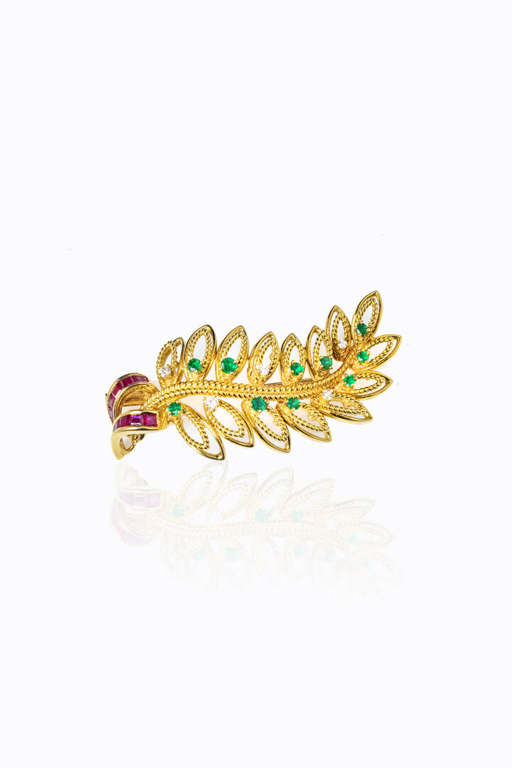 Spilla in oro giallo, firmata "Meister", a foglia traforata e lavora a corda, con smeraldini taglio rotondo e cinque diamanti taglio brillante per totali ct 0,10 ca