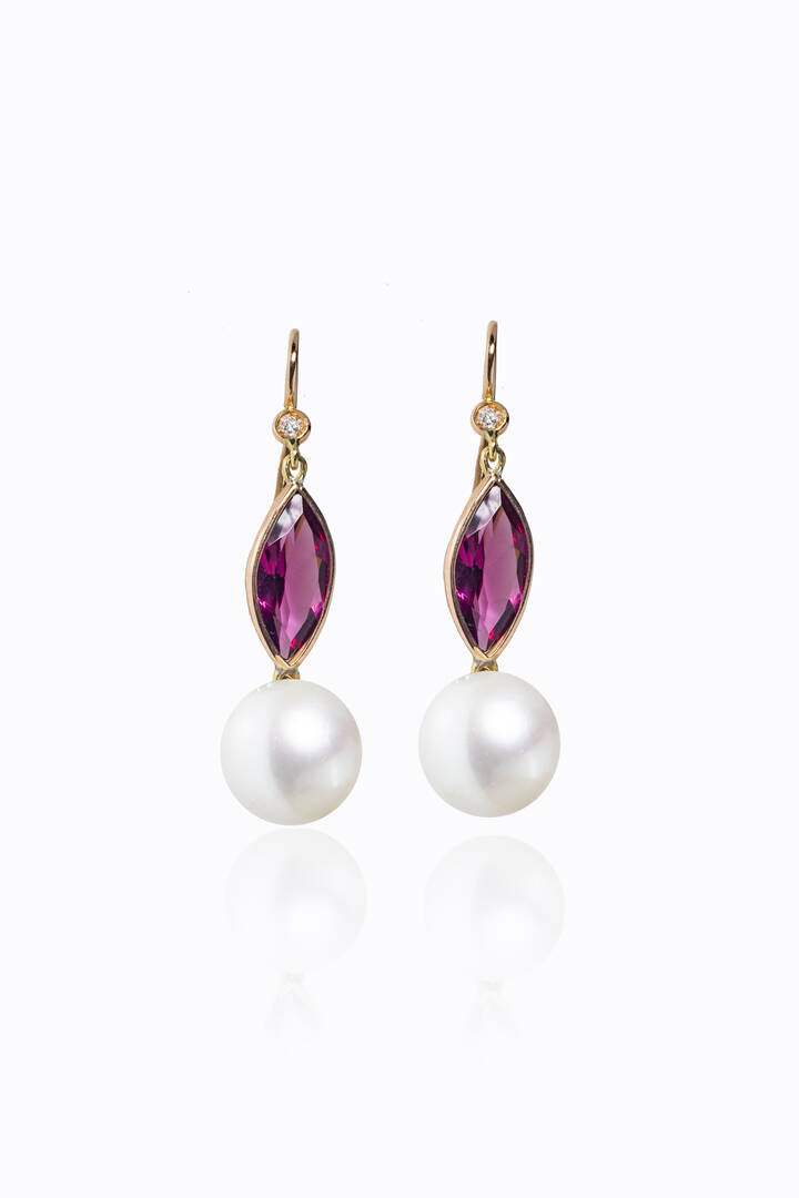 in oro rosa, ad amo, con granato taglio navette e terminanti con due perle di acqua dolce del diam. di mm 12,5