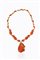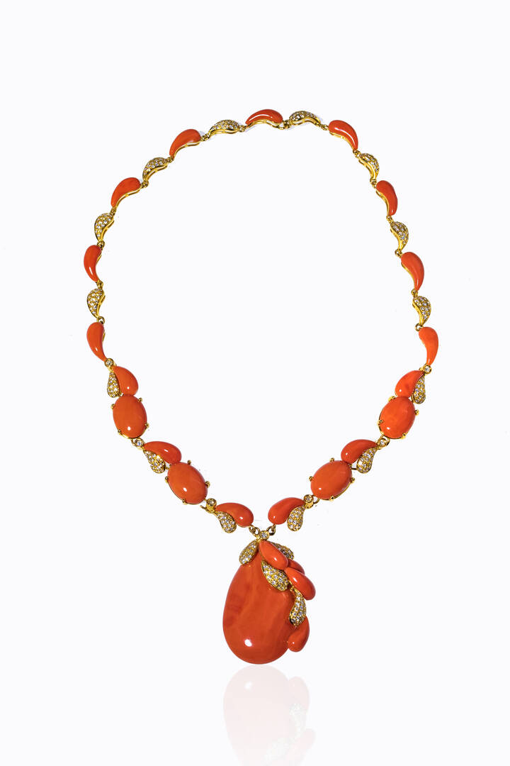 in oro giallo con gocce in corallo rosso alternate a gocce in pavé di diamanti taglio brillante e 8/8 per totali ct 2,50 ca, probabile colore G-H, purezza IF-VVS; al centro grande goccia cabochon di corallo. Firmato "Ciaravolo"
