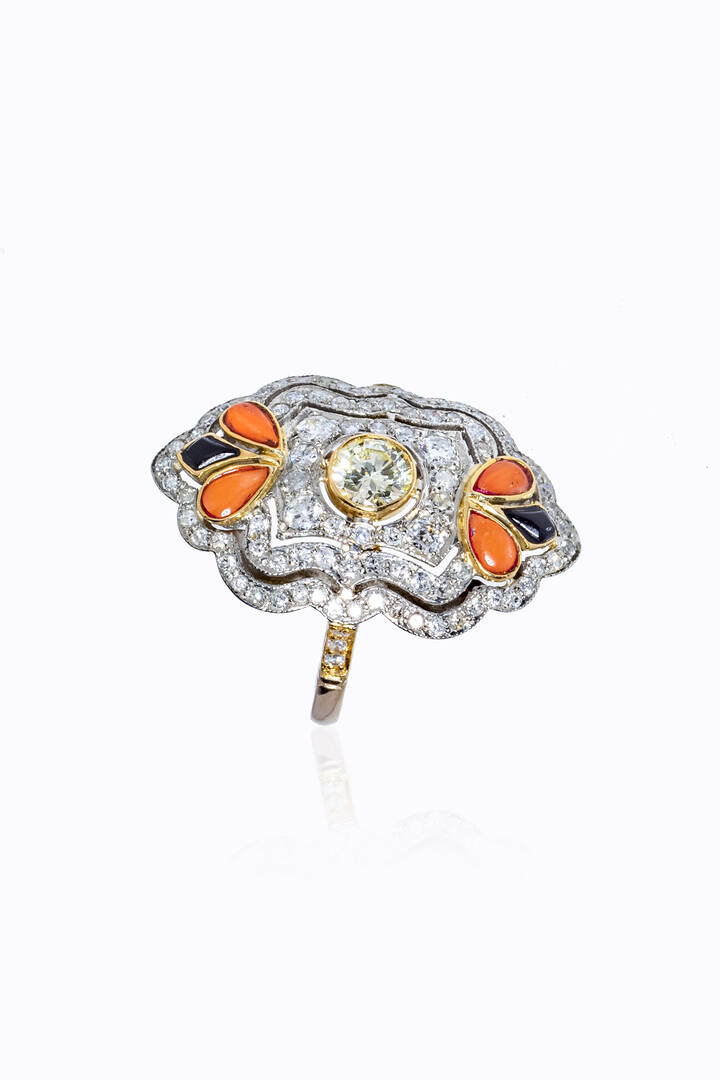 in oro rosa e bianco, sommità mossa, con diamante centrale di ct 0,50 ca, a decoro diamanti taglio brillante, 8/8 e 16/16 per totali ct 1,13 ca e inserti in smalto arancio e onice.