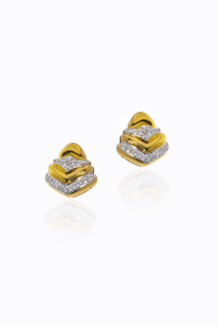 in oro giallo, a lobo, di forma triangolare, bombati, con fasce lisce alternate ad inserti in pavé di diamanti taglio brillante per totali ct 0,80 ca,